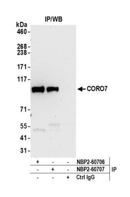 - Immunoprecipitation: CORO7 Antibody [NBP2-60707] - Detection of human CORO7 by western blot of immunoprecipitates. Samples: Whole cell lysate (0.5 or 1.0 mg per IP reaction; 20% of IP loaded) from HeLa cells prepared using NETN lysis buffer. Antibodies: Affinity purified rabbit anti-CORO7 antibody NBP2-60707 used for IP at 20 ul per reaction. CORO7 was also immunoprecipitated by rabbit anti-CORO7 antibody NBP2-60706. For blotting immunoprecipitated CORO7, NBP2-60707 was used at 1:250. Detection: Chemiluminescence with an exposure time of 30 seconds.