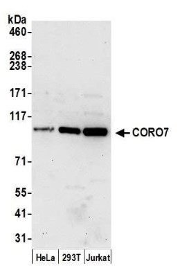- Western Blot: CORO7 Antibody [NBP2-60707] - Detection of human CORO7 by western blot. Samples: Whole cell lysate (50 ug) from HeLa, 293T, and Jurkat cells prepared using NETN lysis buffer. Antibody: Affinity purified rabbit anti-CORO7 antibody NBP2-60707 used for WB at 1:1000. Detection: Chemiluminescence with an exposure time of 30 seconds.