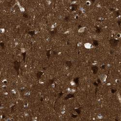 - Immunohistochemical staining of human cerebral cortex shows strong cytoplasmic and nuclear positivity in neuronal cells.