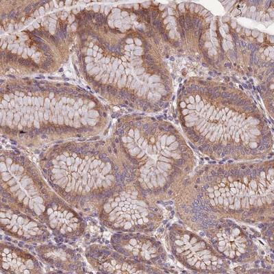 - Immunohistochemistry: LAMB4 Antibody [NBP2-14182] - Staining of human stomach shows moderate positivity.