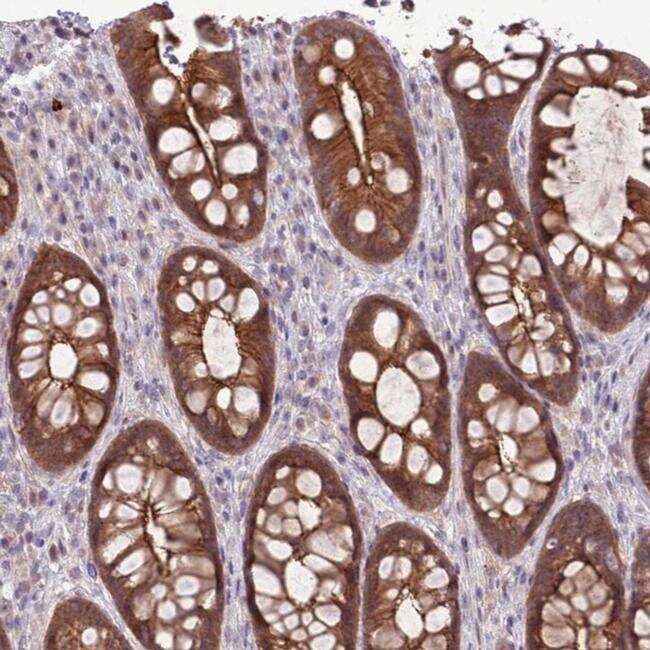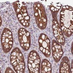 - Immunohistochemical staining of SHROOM3 in human rectal tissue shows strong cytoplasmic and membranous positivity in glandular cells. Samples were probed using a SHROOM3 Polyclonal Antibody (Product # PA5-61589).
