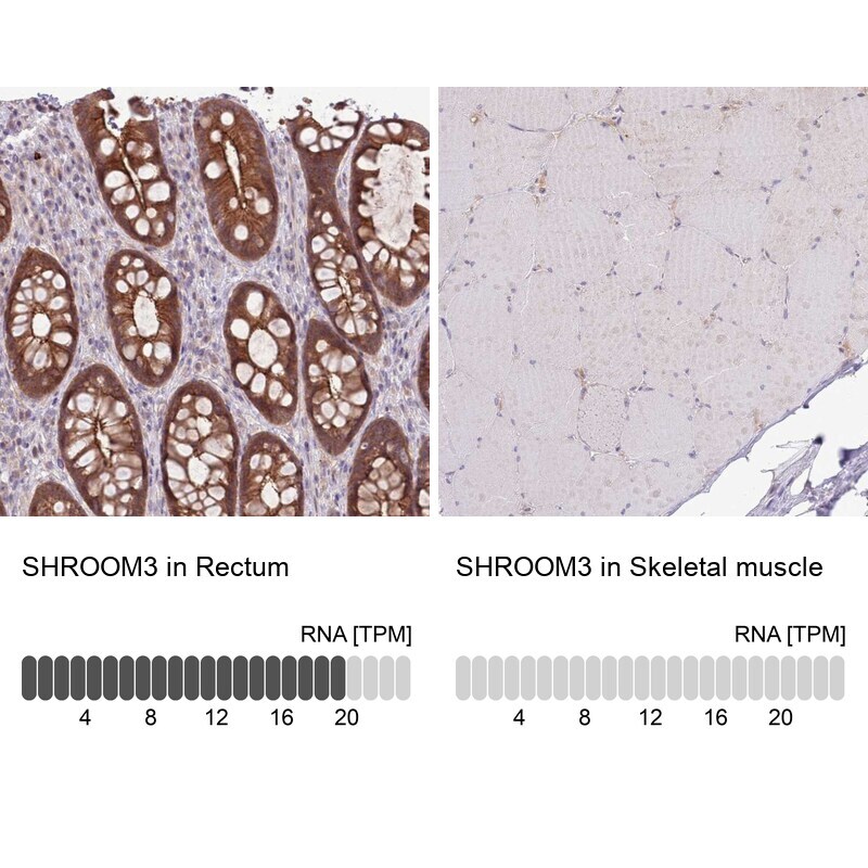 - Immunohistochemical staining of SHROOM3 in human rectum and skeletal muscle tissues using SHROOM3 Polyclonal Antibody (Product # PA5-61589). Corresponding SHROOM3 RNA-seq data are presented for the same tissues.