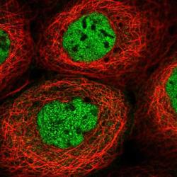 - Immunofluorescent staining of SHROOM3 in human cell line A-431 shows positivity in nucleus but excluded from the nucleoli. Samples were probed using a SHROOM3 Polyclonal Antibody (Product # PA5-61589).