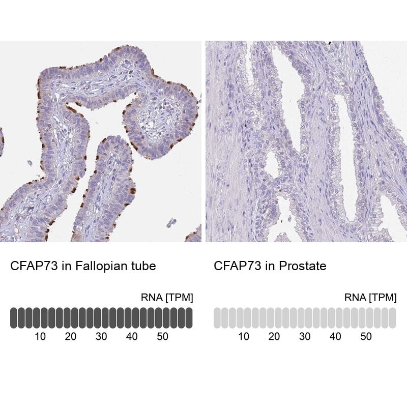 - Immunohistochemical staining of CCDC42B in human fallopian tube and prostate tissues using CCDC42B Polyclonal Antibody (Product # PA5-61765). Corresponding CFAP73 RNA-seq data are presented for the same tissues.