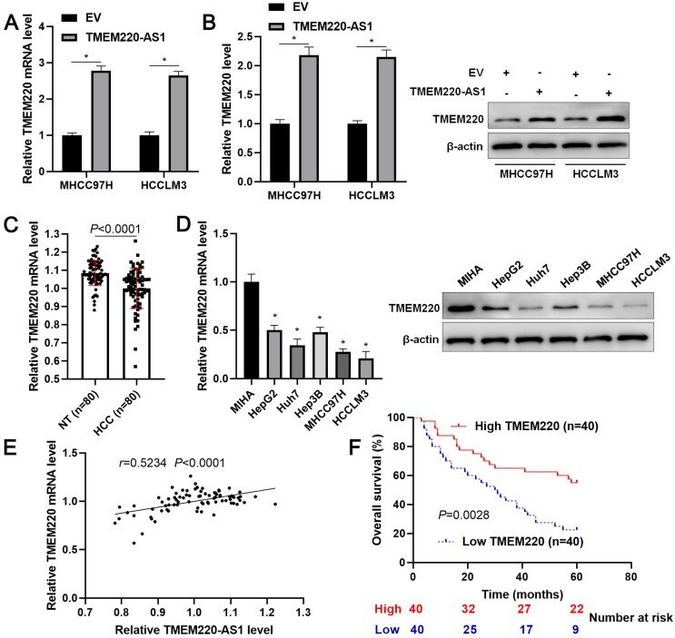 - Figure 3 TMEM220 is a target of TMEM220-AS1. (A) HCC cells were transfected with pcDNA3.1 vector carrying TMEM220-AS1 or with empty vector (EV) and TMEM220 mRNA was detected using RT-qPCR. (B) Western blotting analysis revealed that TMEM-220-AS1 overexpression upregulated TMEM220 protein levels in HCC cells. (C) The levels of TMEM220 mRNA were measured in 80 pairs of HCC and nontumor (NT) tissues. (D) TMEM220-AS1 expression was assessed in MIHA, HCCLM3, Huh7, HepG2, Hep3B, and MHCC97H cells. (E) TMEM220-AS1 was positively associated with TMEM220 mRNA expression in HCC tissue samples. (F) The survival of HCC patients with low versus high TMEM220 expression was compared. * P
