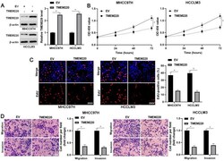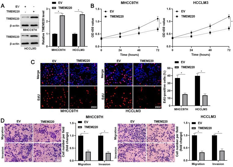 - Figure 4 TMEM220 suppresses the migration, invasion, and proliferation of HCC cells. (A) MHCC97H and HCCLM3 cells were transfected with pcDNA3.1 vector carrying TMEM220 or with empty vector (EV) and TMEM220 analyzed using western blotting analysis. (B) TMEM220 overexpression suppressed HCC cell viability, as determined using CCK-8 assay. (C) EdU assay confirmed that TMEM220 overexpression weakened HCC cell proliferation. (D) The number of migrated and invaded HCC cells was decreased by TMEM220 overexpression. * P