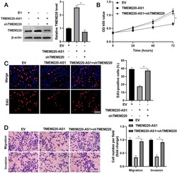 - Figure 5 TMEM220 knockdown reverses the inhibitory effect of TMEM220-AS1 in HCCLM3 cells. (A) Western blot analysis showed that TMEM220 levels were reduced by TMEM220 shRNA (shTMEM220) in TMEM220-AS1-overexpressing HCCLM3 cells. ( B ) MTT, ( C ) EdU, and ( D ) transwell analyses demonstrated that TMEM220 knockdown reversed the suppressive role of TMEM220-AS1 in HCCLM3 cells. * P