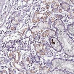 - Immunohistochemistry-Paraffin: IGIP Antibody [NBP2-14118] - Staining of human stomach, lower shows moderate cytoplasmic positivity in glandular cells.