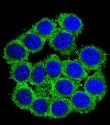 - Confocal immunofluorescent analysis of CUZD1 Antibody (C-term)(Cat#AP51141PU-N) with 293 cell followed by Alexa Fluor? 488-conjugated goat anti-rabbit lgG (green). DAPI was used to stain the cell nuclear (blue).