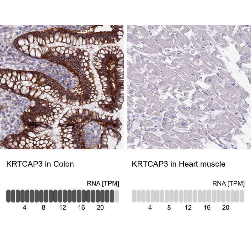 - Immunohistochemistry analysis in human colon and heart muscle tissues using Anti-KRTCAP3 antibody. Corresponding KRTCAP3 RNA-seq data are presented for the same tissues.