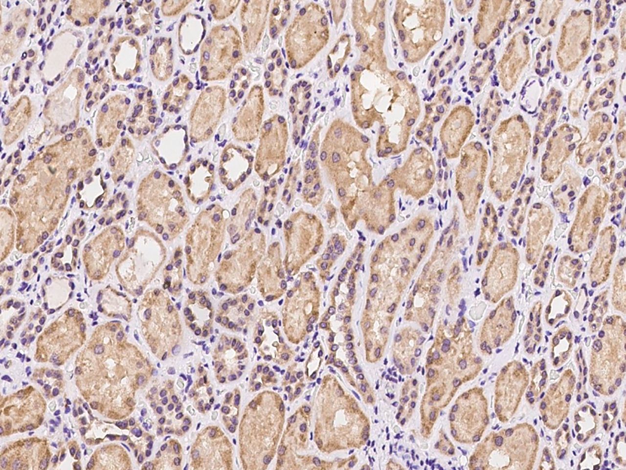 - Immunohistochemistry analysis of PET117 in formalin-fixed paraffin embedded human kidney sections. Samples were incubated with PET117 polyclonal antibody (Product # PA5-148329) using a dilution of 1:100.
