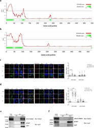 - Fig. 5 ApoJ co-localized with SOAT2 by recognizing the IDR region. The IDR regions of SOAT1 (UniProt ID: P35610, a ) and SOAT2 (UniProt ID: O75908, b ) were predicted by D 2 P 2 ( http://d2p2.pro/search ) and IUPred2A ( https://iupred2a.elte.hu/ ) algorithms, respectively. Huh7 cells were transfected with SOAT1-DsRed ( c , the left panels), IDR-truncated SOAT1-DsRed (DeltaSOAT1-DsRed, c , the right panels); SOAT2-DsRed ( d , the left panels), and IDR-truncated SOAT2-DsRed (DeltaSOAT2-DsRed, d the right panels), followed by administration of PA (100 muM) or OA (400 muM) for 24 h, and visualized with confocal microscopy. The fluorescence intensity was analysed by FVW31S software. The Mander''s coefficient was analysed by ImageJ with the Coloc2 plugin from ImageJ/Fiji shown above. Scale bar, 5 mum. Huh7 cells were transfected with plasmids encoding SOAT2-DsRed ( e ) or DeltaSOAT2-DsRed ( f ). The cell lysates were immunoprecipitated with antibody against ApoJ and examined by western blot analysis recognizing DsRed and apoJ.