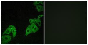 - Immunofluorescence analysis of A549 cells, using OR4C3 antibody.The picture on the right is treated with the synthesized peptide.
