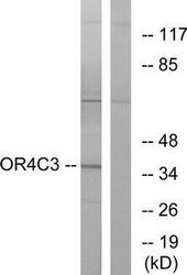 - Western blot analysis of extracts from K562 cells, using OR4C3 antibody.The lane on the right is treated with the synthesized peptide.