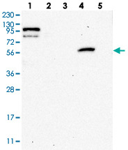- Western blot analysis of Lane 1: RT-4, Lane 2: U-251 MG, Lane 3: Human Plasma, Lane 4: Liver, Lane 5: Tonsil with LEKR1 polyclonal antibody (Cat # PAB27520) at 1:100-1:250 dilution.