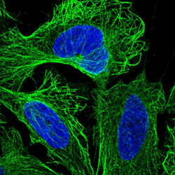 - Immunofluorescent staining of human cell line U-2 OS with LEKR1 polyclonal antibody (Cat # PAB27520) at 1-4 ug/mL dilution shows positivity in cytoskeleton (microtubules).
