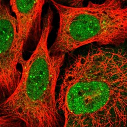- Immunofluorescent staining of human cell line U-2 OS shows localization to nucleoplasm, nuclear bodies & the Golgi apparatus.