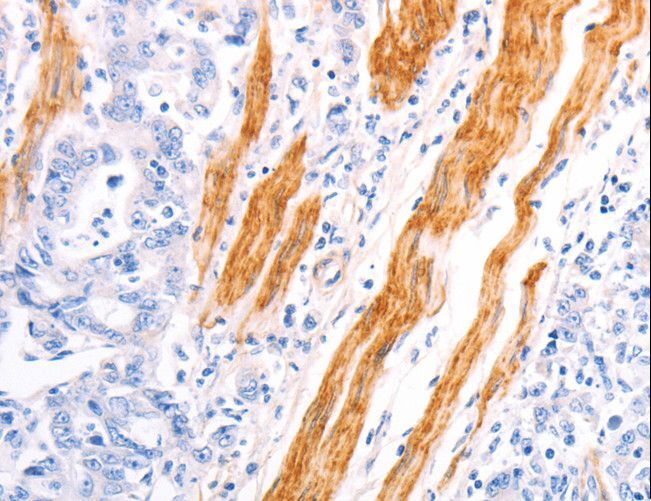 - Immunohistochemistry of paraffin-embedded Human gastric cancer using TPM1 Polyclonal Antibody at dilution of 1:40.