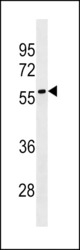 - LRRC69 Antibody (Center) (Cat. #AP19147c) western blot analysis in HepG2 cell line lysates (35ug/lane).This demonstrates the LRRC69 antibody detected the LRRC69 protein (arrow).