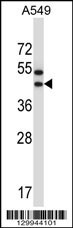 - OR56A1 Antibody (C-term) (Cat. #AP14183b) western blot analysis in A549 cell line lysates (35ug/lane).This demonstrates the OR56A1 antibody detected the OR56A1 protein (arrow).