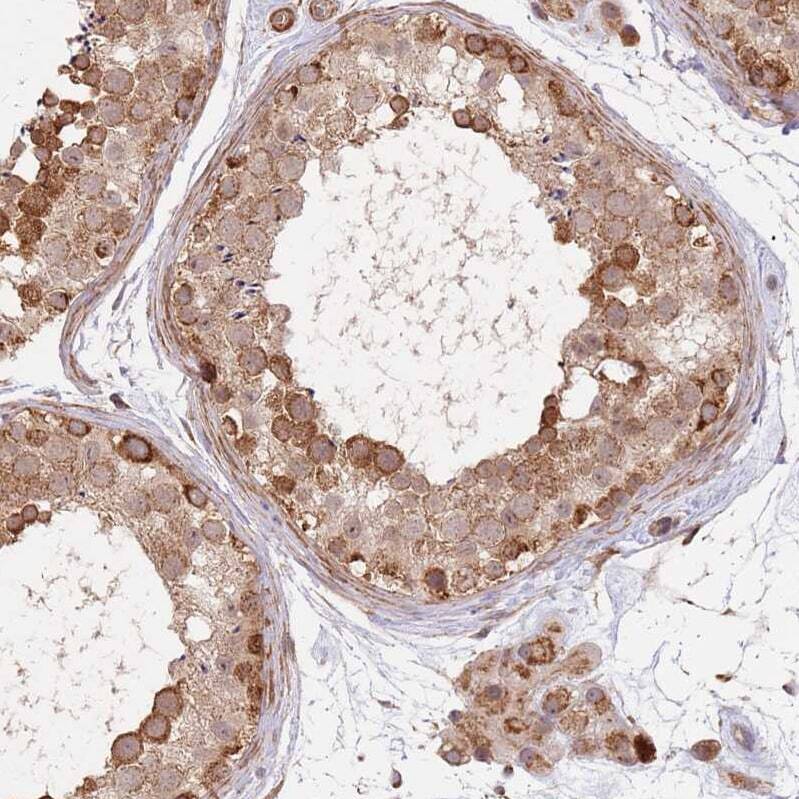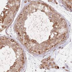 - Immunohistochemical analysis of UQCC3 in human testis using UQCC3 Polyclonal Antibody (Product # PA5-61352) shows moderate cytoplasmic granular positivity in cells in seminiferous ducts and Leydig cells.