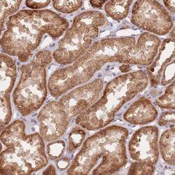 - Immunohistochemical analysis of UQCC3 in human kidney using UQCC3 Polyclonal Antibody (Product # PA5-61352) shows strong cytoplasmic granular positivity in cells in tubules.
