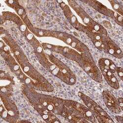 - Immunohistochemical analysis of UQCC3 in human duodenum using UQCC3 Polyclonal Antibody (Product # PA5-61352) shows strong cytoplasmic granular positivity in glandular cells.