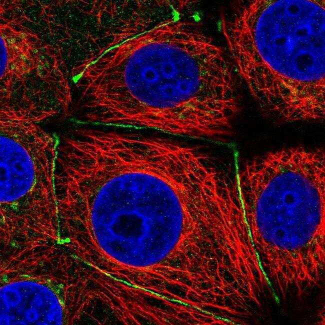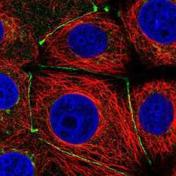 - Immunofluorescent staining of TMEM251 in human cell line MCF7 shows positivity in the Golgi apparatus & cell junctions. Samples were probed using a TMEM251 Polyclonal Antibody (Product # PA5-61769).
