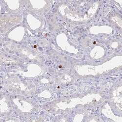- Immunohistochemical analysis of TMEM251 in human kidney using TMEM251 Polyclonal Antibody (Product # PA5-61769) shows moderate membranous and cytoplasmic positivity in leukocytes.