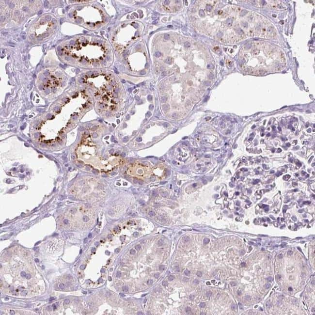 - Immunohistochemical analysis of OR2AK2 in human kidney using OR2AK2 Polyclonal Antibody (Product # PA5-62635) shows strong, granular cytoplasmic positivity in distal tubules.