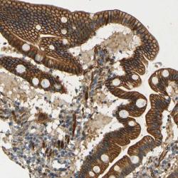 - Immunohistochemical staining of human duodenum shows strong cytoplasmic and membranous positivity in glandular cells.