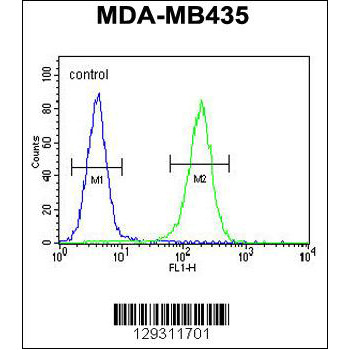 - TTLL13 Antibody (Center) (Cat. #OAAB07729) flow cytometric analysis of MDA-MB435 cells (right histogram) compared to a negative control cell (left histogram).FITC-conjugated goat-anti-rabbit secondary antibodies were used for the analysis.