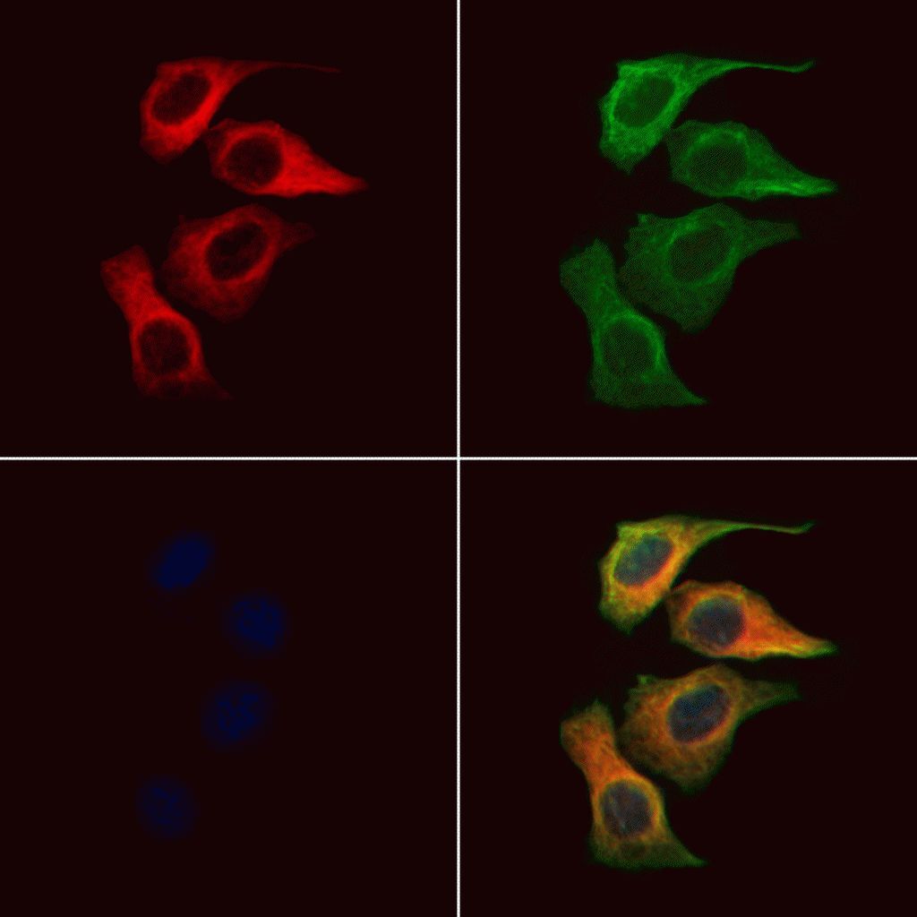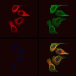 - Immunofluorescent analysis of Ephrin B3 in HeLa cells. Samples were fixed with paraformaldehyde, permeabilized with 0.1% Triton X-100, blocked with 10% serum (45 min at 25°C), incubated with mouse anti-beta tubulin and Ephrin B3 polyclonal antibody (Product # PA5-99619) using a dilution of 1:200 (1 hr, 37°C), and followed by goat anti-rabbit IgG Alexa Fluor 594 (red) and goat anti-mouse IgG Alexa Fluor 488 (green).