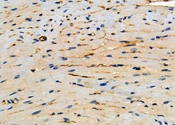 - Immunohistochemistry analysis of Ephrin B3 in mouse heart tissue. The sample was formaldehyde fixed and a heat mediated antigen retrieval step in citrate buffer was performed. Samples were incubated with Ephrin B3 polyclonal antibody (Product # PA5-99619) using a dilution of 1:100 (4°C overnight) followed by HRP conjugated anti-Rabbit secondary antibody.