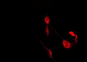- Immunofluorescent analysis of Phospho-Ephrin B1/B2/B3 (Tyr324) in K562. Samples were fixed with paraformaldehyde, permeabilized with 0.1% Triton X-100, blocked with 10% serum (45 min at 25°C) incubated with Phospho-Ephrin B1/B2/B3 (Tyr324) polyclonal antibody (Product # PA5-103267) using a dilution of 1:200 (1 hr, 37°C), and followed by goat anti-rabbit IgG Alexa Fluor 594 at a dilution of 1:600.