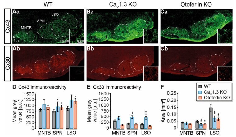 - Figure 1 Expression of astrocyte-related connexins in the superior olivary complex (SOC). ( A - C ), widefield images showing immunoreactivity of Cx43 and Cx30 in the mouse SOC from the wild type (WT) ( Aa (Cx43), Ab (Cx30)), CaV1.3 knock-out (KO) ( Ba (Cx43), Bb (Cx30)) and otoferlin KO ( Ca (Cx43), Cb (Cx30)). Regions used for mean grey value und area analysis are indicated with dashed lines. Insets: Close ups showing the punctate Cx labeling in the lateral superior olive (LSO) center. ( D ), mean grey values of Cx43 immunofluorescence. Cx43 levels were increased in the SPN from both KO models and in the LSO from otoferlin KO. ( E ), mean grey values of Cx30 immunofluorescence. Cx30 was elevated in the SPN and LSO of Ca V 1.3 KO. ( F ), area of nuclei in the SOC. SPN and LSO from both KO models exhibited a reduced area compared to the WT. Mean grey values were background subtracted. ( D - F ) show mean +- SD. Significance levels in panels ( D - F ) were Sidak corrected for two comparisons. The sample size is given in the text of Section 4.2 . * p < 0.025, ** p < 0.005, *** p < 0.0005.