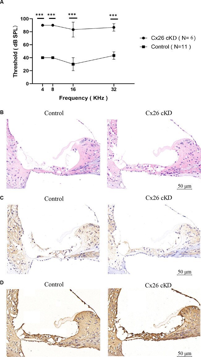 - Effect of tamoxifen injection at P0 on the auditory threshold and connexin expression at P21. (A) Auditory thresholds measured by pure tone ABRs vs. tone frequency; *** p < 0.0001. (B-D) Transverse sections of the cochlear duct stained with hematoxylin-eosin (B) or with antibodies selective for Cx26 (C) or Cx30 (D) . Scale bars = 50 mum.