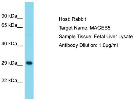 - Host: Rabbit; Target Name: MAGEB5; Sample Tissue: Fetal Liver lysates; Antibody Dilution: 1.0 ug/ml