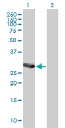 - Western Blot: TAK1L Antibody [H00056911-B01P] - Analysis of C21orf7 expression in transfected 293T cell line by C21orf7 polyclonal antibody. Lane 1: C21orf7 transfected lysate(26.62 KDa). Lane 2: Non-transfected lysate.
