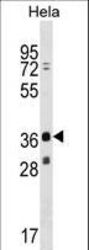 - MAGEB16 Antibody western blot of HeLa cell line lysates (35 ug/lane). The MAGEB16 antibody detected the MAGEB16 protein (arrow).