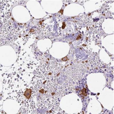 - Immunohistochemistry: Melanoma Antigen Family B16 Antibody [NBP2-31002] - Staining of human bone marrow shows strong positivity in megakaryocytes and thrombocytes.