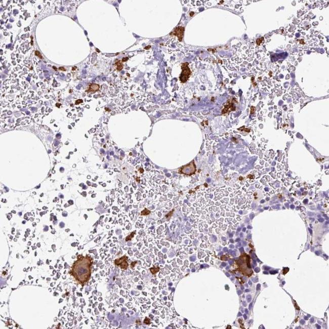 - Immunohistochemical staining of MAGEB16 in human bone marrow shows strong positivity in megakaryocytes and thrombocytes. Samples were probed using a MAGEB16 Polyclonal Antibody (Product # PA5-63168).