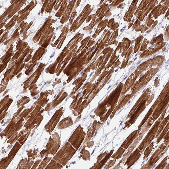 - Immunohistochemical analysis of WDR38 in human heart muscle using WDR38 Polyclonal Antibody (Product # PA5-63327) shows strong cytoplasmic positivity in myocytes.