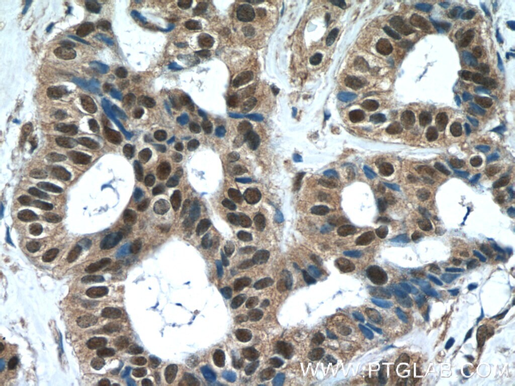 - Immunohistochemistry of paraffin-embedded human breast cancer tissue slide using 25683-1-AP ( WDR38 Antibody) at dilution of 1:50 (under 40x lens).