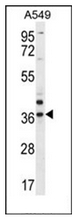 - Western blot analysis of OR5H14 Antibody (C-term) Cat.-No AP53090PU-N in A549 cell line lysates (35ug/lane). This demonstrates the OR5H14 antibody detected the OR5H14 protein (arrow