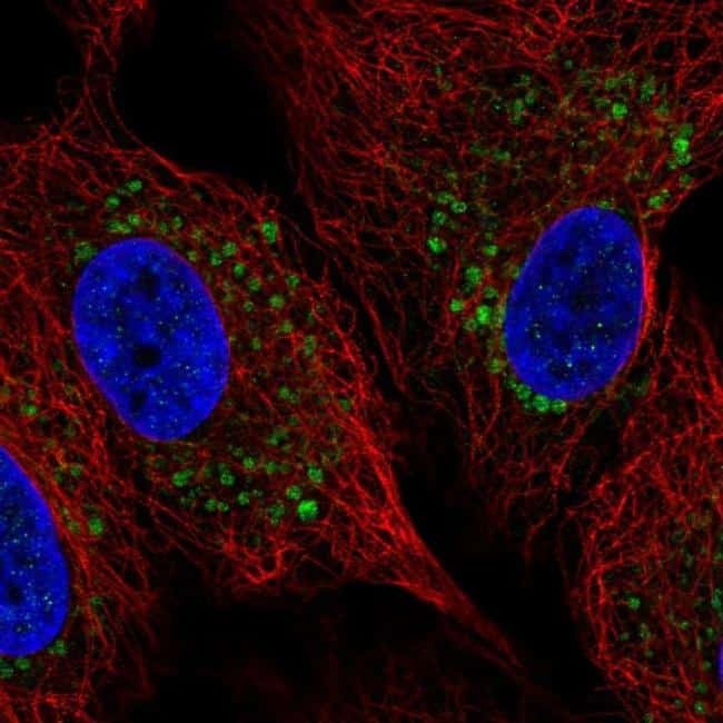 - Immunofluorescent staining of ZDHHC11B in human cell line A549 shows localization to lipid droplets. Samples were probed using a ZDHHC11B Polyclonal Antibody (Product # PA5-67029).