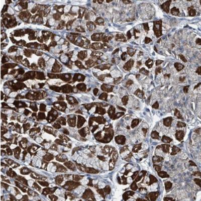 - Immunohistochemistry: ABHD18 Antibody [NBP2-30812] - Staining of human stomach, upper shows strong cytoplasmic positivity in glandular cells.