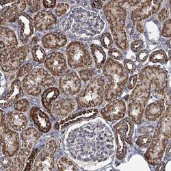 - Immunohistochemical analysis of C4orf29 in human kidney using C4orf29 Polyclonal Antibody (Product # PA5-62150) shows strong cytoplasmic granular positivity in cells in tubules.