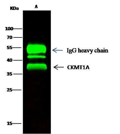- Immunoprecipitation of CKMT1A was performed on (Lane A) 0.5 mg A431 whole cell lysate using 2 µL of CKMT1A Polyclonal Antibody (Product # PA5-112146) at a dilution of 200, and 15 µL of 50 % Protein G agarose. A Dylight 800-labeled antibody to rabbit IgG (H+L) was used as a secondary antibody at a dilution of 1:5000. Developed using the odssey technique and performed under reducing conditions. Predicted band size: 38 kDa. Observed band size: 38 kDa.