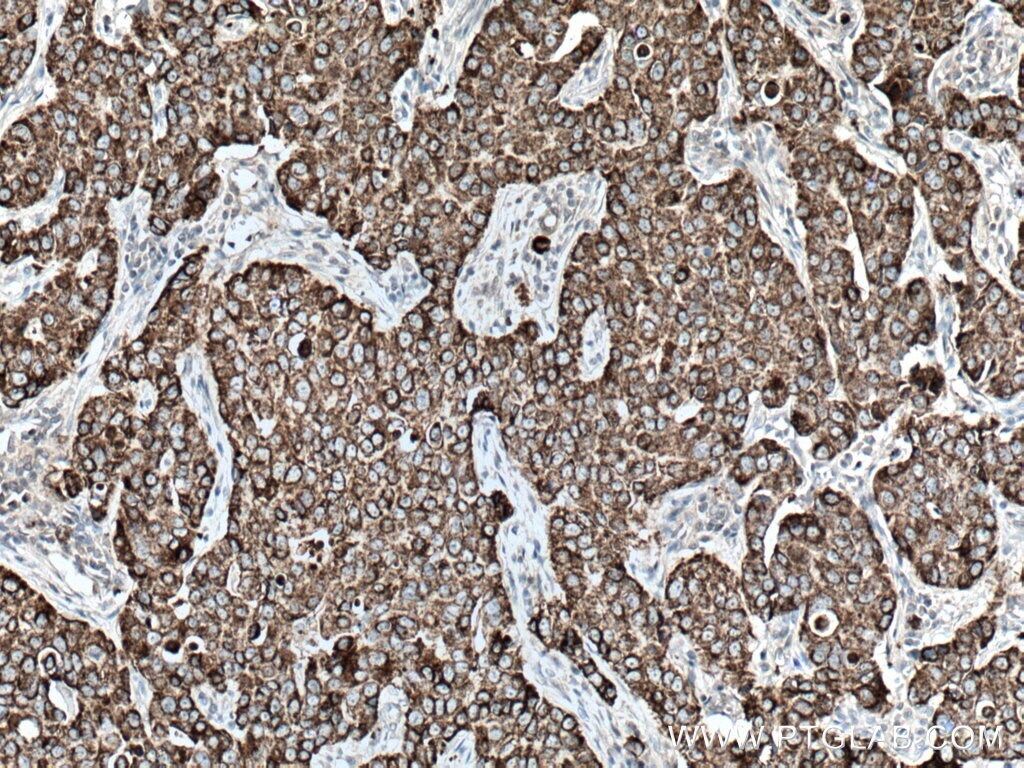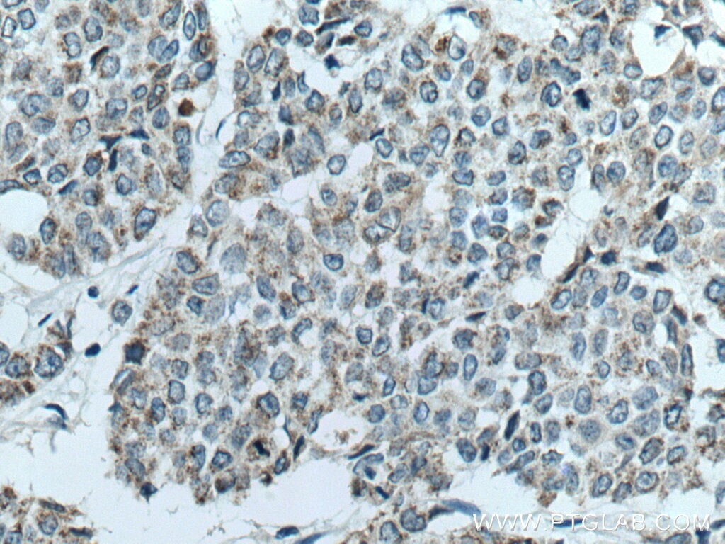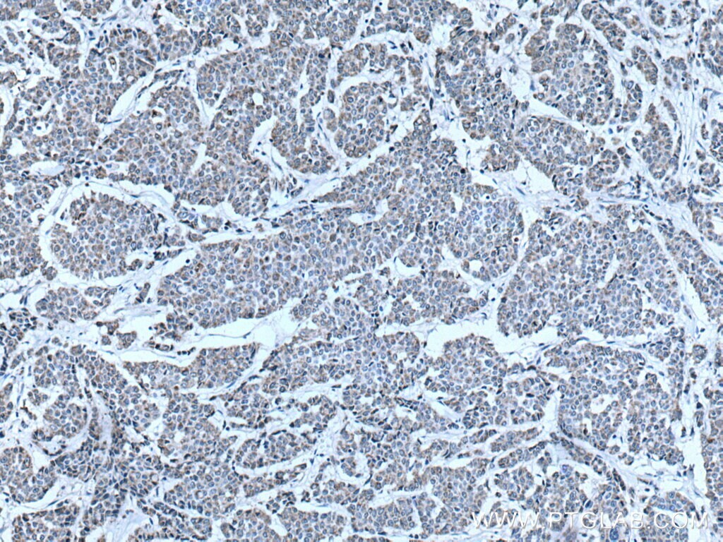 - Immunohistochemistry of paraffin-embedded human breast cancer tissue slide using 15346-1-AP (CKMT1A antibody) at dilution of 1:200 (under 40x lens) heat mediated antigen retrieved with Tris-EDTA buffer (pH 9).